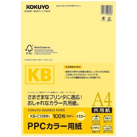 【1000円以上お買い上げで送料無料♪】コクヨ PPCカラー用紙(共用紙)FSC認証A4 100枚 黄 - メール便発送