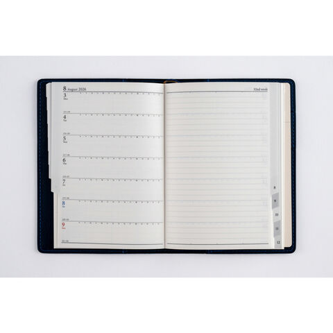 【月間予定表】ブロック式のカレンダーにはインデックスも付いていて便利です。前次月のカレンダーも載っているので、他の月も一覧できます。 【週間予定表】左ページは1週間分のスケジュール欄、右ページはフリーのメモ欄。左ページにはさりげない時間軸表記もあるので、時間ごとの予定管理もできます。