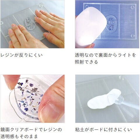クリアボードの上に温めたライナーモールドを乗せることで、自由に好きな形のレジンや粘土のプレートを作ることができます。