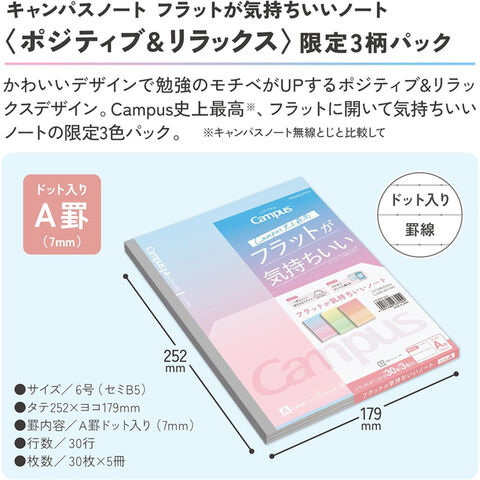 限定 キャンパス フラットが気持ちいいノート ポジティブ&リラックス セミB5 3冊パック A罫/7mm ドット入 中高生 コクヨ