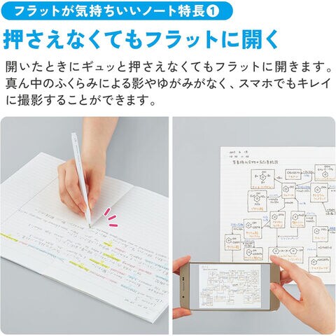 ノートの真ん中のふくらみをギュッと押さえなくてもフラットに開きます。