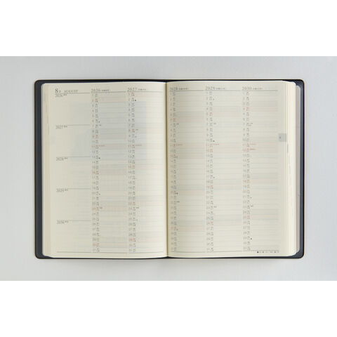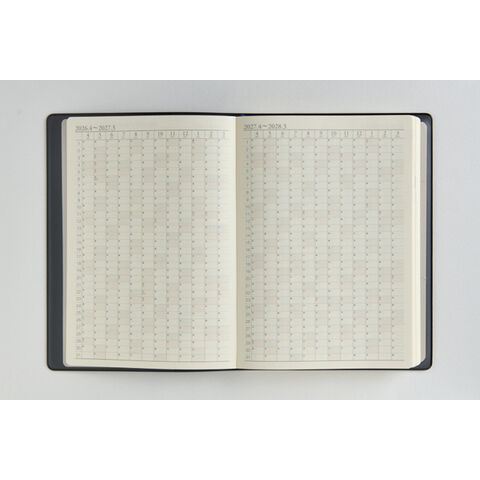 【月間予定表】長期プロジェクトを管理しやすい見開き1ヵ月×5年分の横罫式カレンダー。記入スペースが横に長いので記入がしやすく、一覧性に優れています。5年分掲載しているので、年ごとのスケジュールが比較しやすいです。左側にはフリーのメモスペース付きです。 【週間予定表】昨年の今日は何をしていたか、一目瞭然の5年対比。年ごとの比較や長期計画の立案に役立ちます。