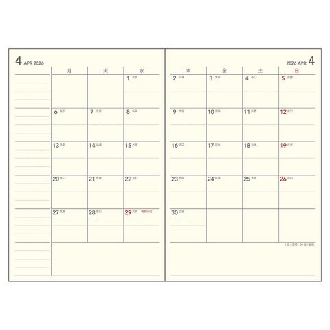 1ヶ月の予定を曜日ごとに管理しやすい、カレンダーと同じ感覚で使える月間レイアウトです。簡単に予定を管理したい人や曜日ごとの決まった予定の多い方におすすめです。1日の枠が上下半分に区切られているので、午前・午後や仕事・プライベートなど分けて管理できます。