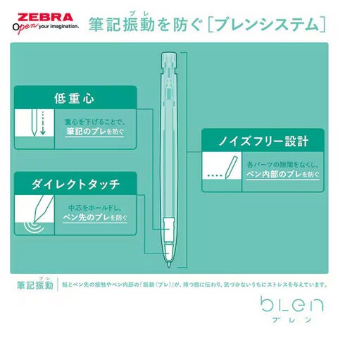 ペン内部の隙間をなくし、ペン中芯をホールドする部品や金属製の重りを内蔵した「ブレンシステム」を搭載することで筆記振動を防ぎます。