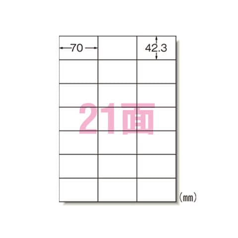 いろいろなプリンタで印刷できるマルチタイプのラベルです。各種表示用のラベルが手軽にキレイに作れます。再はくりタイプです。高品質の素材を使用しているため、印刷適性に優れています。●シートサイズ:A4判 (210×297mm)●面付:21面 3列×7段●一片サイズ:70mm×42.3mm●標準総厚み:125g/㎡(0.13mm)●ラベル厚み:0.08mm●材質:上質紙●入数:100シート(2100片)●インクジェット(染料+顔料)、レーザー、コピー、熱転写、ドット