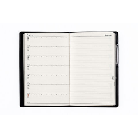 【月間予定表】カレンダーと同じような感覚で見ることができ、週ごとの予定が把握しやすいブロックタイプ。巻頭に1年分まとまっています。左端の一列はフリーのメモ欄になっています。 【週間予定表】左ページは1週間分のスケジュール欄、右ページはフリーの横ケイメモ。スケジュール欄にはタイム目盛りも付いていて、忙しいあなたの予定をしっかり管理します。