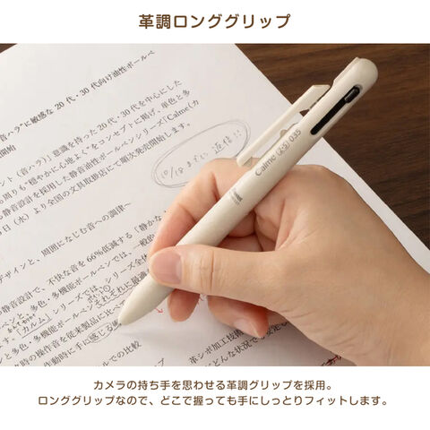 「カチカチ」というノック音を大幅低減した、油性ボールペン「Calme (カルム)」です。