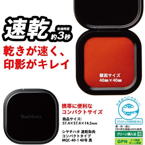 携帯に便利なコンパクトタイプの朱肉です。PPC用紙で乾燥時間約3秒です。●顔料系インキ●規格:40号●本体色:黒●盤面サイズ:40×40mm●材質:蓋・枠・底にPBT使用