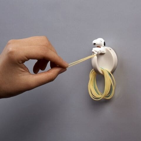 輪ゴムがからまず、1本ずつ外せる、スヌーピーが付いた可愛い輪ゴムフック。輪ゴム以外にも、軽い小物掛けとしても使えます。付属の補助鉄板を使えば、マグネットが直接くっつかない場所でも取り付けられます。サイズ: 4.5×3×5.5cm取付方法:マグネット耐荷重:500g取り付けられる場所:冷蔵庫・洗濯機などの金属塗装面、ホーロー流し台、スチール製品など