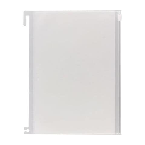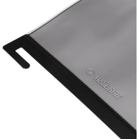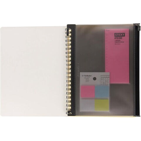 しっかり密閉できるスライダー式で、中身が落ちる心配はありません。巻末のクリアポケットと比べると、収納スペースの幅が約1cmほど小さくなります。リングに上部の爪を引っ掛け、下部の穴をリングにセットして固定します。簡単に着脱できるので、セットするページ位置は自由に変更可能。冊子を閉じた状態だとページの右端からスライダーの開閉部分が見えるので、ブックマークのように使うこともできます。A5サイズのほか、M、Lもあります。