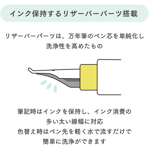 ペン先を軽く水で流すだけで、簡単に色替えができるので、たくさんの色のインクを手間なく気軽に楽しめます。
