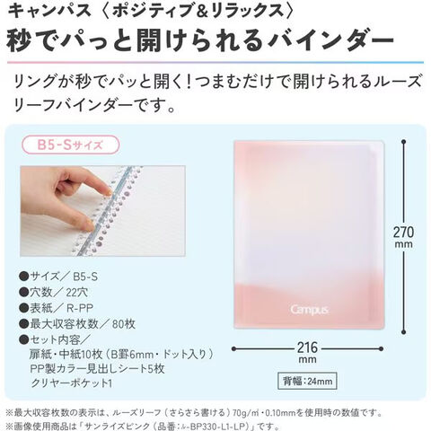 【1000円以上お買い上げで送料無料♪】限定 キャンパス 秒でパっと開けられるバインダー B5-S ポジティブ&リラックス サンライズピンク B罫/6mm 10枚入 コクヨ - メール便発送のレビュー
