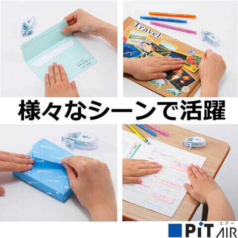軽い引き心地のピットエアーから、持ち運びに便利なコンパクトサイズが登場!詰め替えてくり返し使えるので経済的。網目形状のテープで、良好なのり切れと強い粘着力の両立を実現。厚みのある封筒の端も剥がれづらく、封かん作業やしっかり貼りたいプリントにも安心です。気になるテープのりの走行音を低減。授業中、図書館、オフィス等、静かな場所でも音を気にせず、のり付け作業ができます。