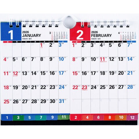 カラフルな2ヵ月一覧型。見たい月を素早くめくれるカラフルインデックス付き。2年分を一覧できる年間カレンダーが付いているので、長期計画の立案もしっかりサポートしてくれます。裏面が横ケイメモになっているので、ちょっとしたメモや備忘録としてご活用いただけます。エコで地球にやさしい、シンプルな壁掛・卓上兼用タイプのカレンダー[B7サイズ×2面]