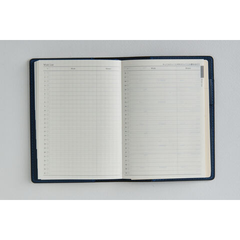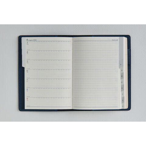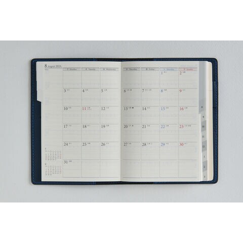 【月間予定表】カレンダーのような感覚で使え、週ごとの予定が把握しやすいブロック式。平日の仕事の予定や、週末土日の予定をまとめて書きやすい月曜始まり。前次月のカレンダーも載っているので、他の月も一覧できます。開くのに便利なインデックス付きです。 【週間予定表】左ページは1週間分のスケジュール欄、右ページは横罫メモのレフト式。スケジュール欄には時間目盛りも付いているので、時間ごとの予定もしっかり管理できます。