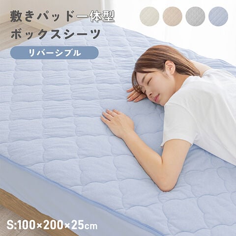 敷きパッド一体型ボックスシーツ シングル 綿100% パイル 吸湿 タオル地 コットン リバーシブル 吸水速乾 ニットワッフル オールシーズン シーツ マットレスカバー 【スモークブルー】