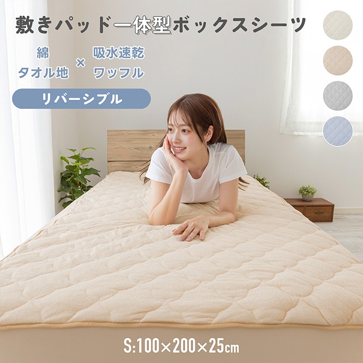 敷きパッド一体型ボックスシーツ シングル 綿100% パイル 吸湿 タオル地 コットン リバーシブル 吸水速乾 ニットワッフル オールシーズン シーツ マットレスカバー 【ミストグレー】