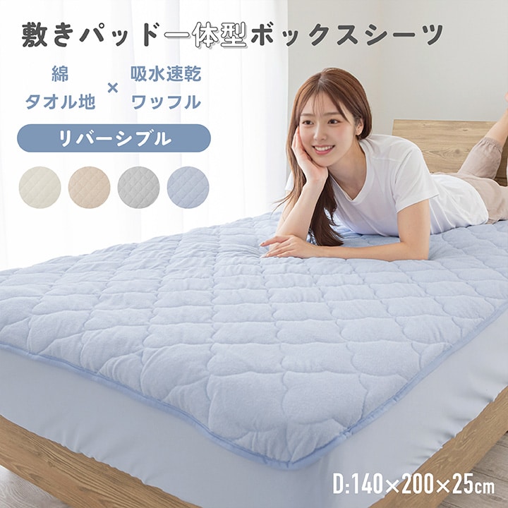敷きパッド一体型ボックスシーツ ダブル 綿100% パイル 吸湿 タオル地 コットン リバーシブル 吸水速乾 ニットワッフル オールシーズン シーツ マットレスカバー 【サンドベージュ】