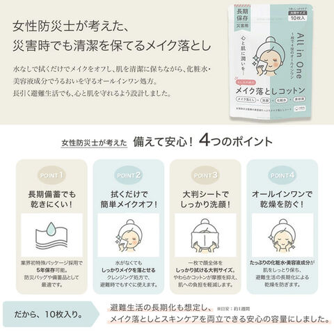 メイクを落とすだけでなく、洗顔や保湿など長引く避難生活で使用可能。