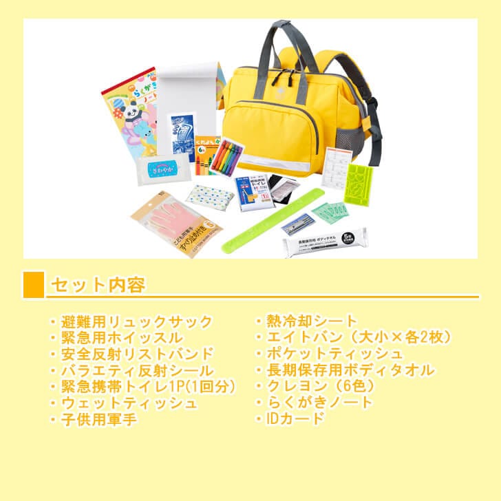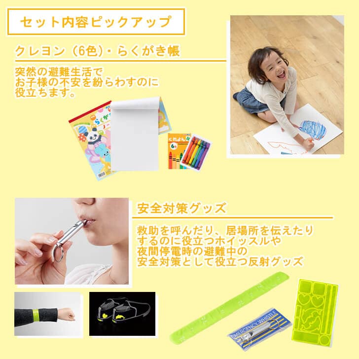 避難生活で役立つ防災グッズも充実しているお子様用の防災セットです。