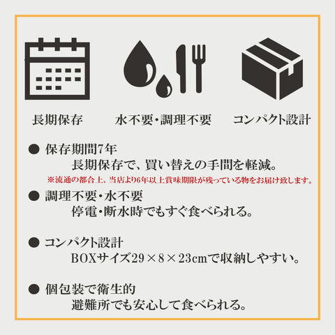 注意事項 賞味期限は製造日より7年となりますが、流通の都合上弊社より6年以上賞味期限が残っている物を発送させて頂きます。