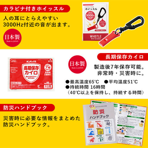 セット内容:アルファ米(五目ごはん)、携帯おにぎり(鮭)、ライスクッキー、5年保存水×2、アルミ製強力9光ライト(単四電池×3本別売り)、カラビナ付きホイッスル、防寒アルミシート、長期保存カイロ、防災ハンドブック