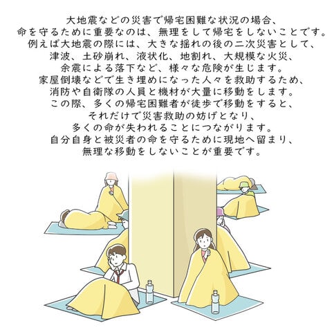 大地震などの災害で帰宅困難な状況の場合、命を守るために重要なのは、無理をして帰宅をしないことです。