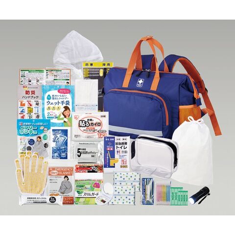 セット内容:避難用リュック、ホイッスル、9光ライト、レインコート、携帯トイレ(大小兼用)1P、ウェットティッシュ(20枚)、静音エマージェンシーブランケット、生理用ナプキン(8入)、シャンプー手袋、長期保存ボディタオル、簡易ポンチョ、防災ハンドブック、スクエアポーチ、マスク、ポケットティッシュ×2、あぶらとり紙、軍手、綿棒10P、エイトバン(大小×各2)、熱冷却シート(2枚入)、衣類収納巾着袋、ソーイングセット、使い捨てカイロ