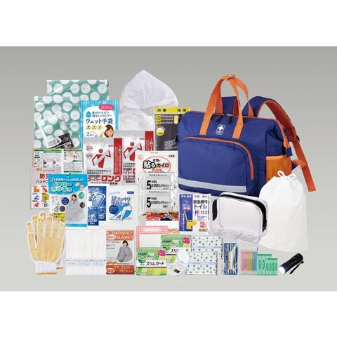 セット内容:避難用リュック、ホイッスル、9光ライト、レインコート、携帯トイレ(大小兼用)2P、ウェットティッシュ(20枚)×2、静音エマージェンシーブランケット、生理用ナプキン(8入)×2、シャンプー手袋、ウェットボディタオル×2、簡易ポンチョ、衣類圧縮袋(大小セット)、マスク×2、スクエアポーチ、ポケットティッシュ×2、防災ハンドブック、足スッキリ爽快シート(4枚入)、コットンパフ、あぶらとり紙、軍手、綿棒10P、エイトバン(大小×各2)、熱冷却シート(2枚入)、衣類収納巾着袋、ソーイングセット、使い捨てカイロ