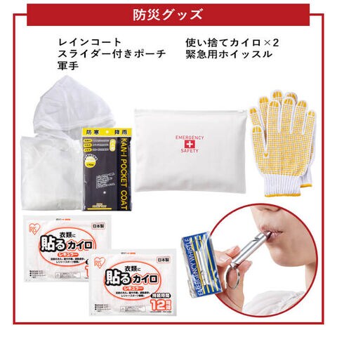 避難時にすぐに役立つホイッスルなどの防災グッズから、避難生活中に役立つ非常用トイレや衛生用品などの防災グッズ、スマホ充電可能なダイナモエマージェンシーライトまで幅広くセットした1人用の防災セットです。