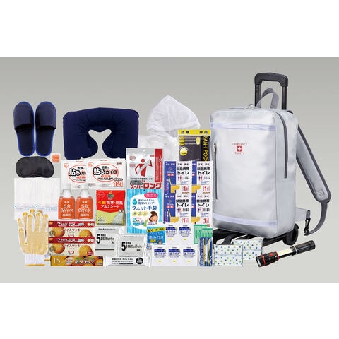 セット内容:避難用リュックバッグ、キャリーカート、COB伸縮2WAYライト、ホイッスル、携帯トイレ(大小兼用)1P×4、防寒アルミシート、ウェットティッシュ(20枚)×2、軍手、使い捨てカイロ×2、レインコート、エイトバン(大小×各2)、ポケットティッシュ×2、ペーパー歯磨き(5包)、シャンプー手袋、ウェットボディタオル、マスク×2、スリッパ、首枕、アイマスク、耳栓、ラップ、備蓄用飲料水(500ml)×2、ライスクッキー×2、長期保存ボディタオル