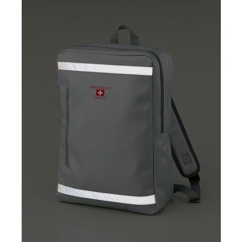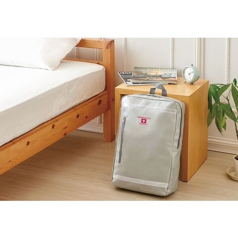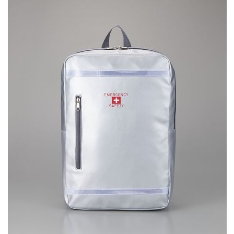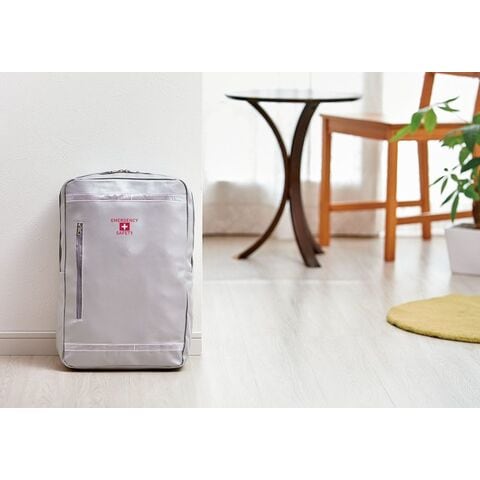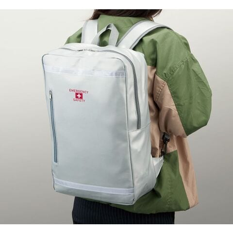 スマートなデザインと防災イメージを両立させたお洒落な避難用リュックに、災害時に役立つ小型懐中電灯や、緊急用トイレ、防寒アルミシートなどの防災グッズをひとまとめにした一人用防災セット。