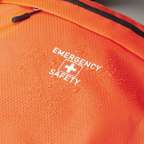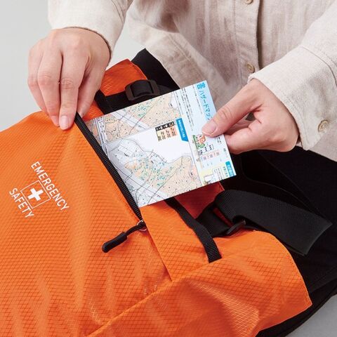 撥水素材で雨の日の避難も安心。保存食もセットされた一人用防災セット。