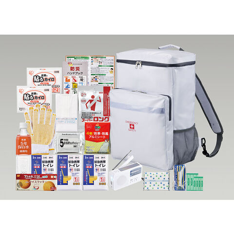 セット内容:ターポリンリュックバッグ、ダイナモエマージェンシーライト、ホイッスル、携帯トイレ(大小兼用)1P×3、防寒アルミシート、ウェットティッシュ(20枚)、軍手、使い捨てカイロ×2、エイトバン(大小×各2)、ウェットボディタオル、ポケットティッシュ、防災ハンドブック、マスク、備蓄用飲料水(500ml)、ライスクッキー
