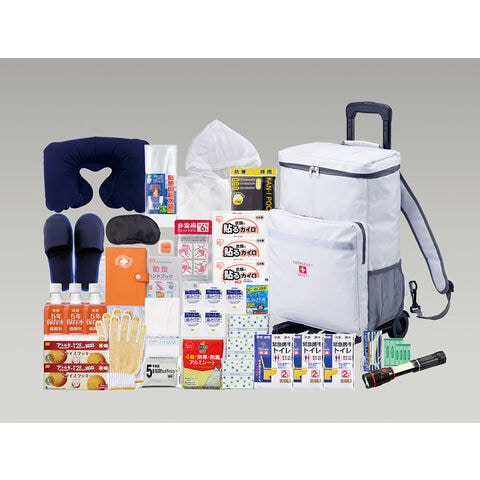 セット内容:ターポリンリュックバッグ、キャリーカート、COB伸縮2WAYライト、ホイッスル、防災手帳(ハンドブック・IDカード付)、携帯トイレ(大小兼用)2P×3、防寒アルミシート、ウェットティッシュ(20枚)、ペーパー歯磨き(5包入)、軍手、使い捨てカイロ×3、レインコート、エイトバン(大小×各2)、非常用ウェットタオル、マスク、首枕、アイマスク、耳栓、スリッパ、備蓄用飲料水(500ml)×3、ライスクッキー×2、ポケットティッシュ×3、給水袋3L※