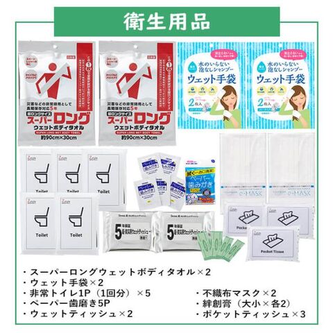 避難先での過ごしやすさを考え、アルミシート・アイマスク・耳栓などの快眠グッズをセットし、ホイッスル・レインコートなどの安全避難用品や、マスク・ボディタオル、ウェットティッシュ・ペーパー歯磨きを含む衛生用品等幅広くセット。