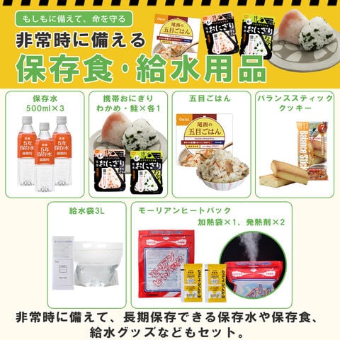 5年保存可能な水とバランスの良い保存食をセット。アレルギー対応や栄養バランスも考慮し、災害時でも安心して食事ができます。
