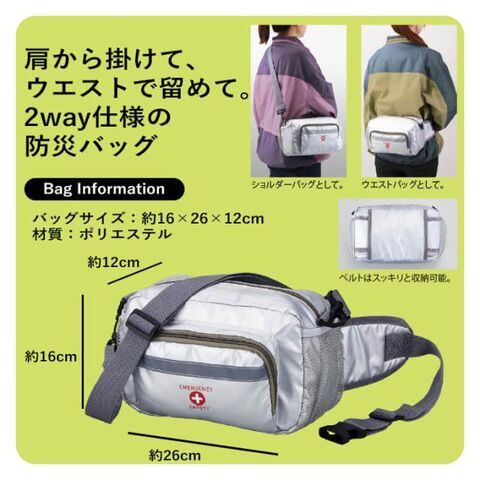 ショルダーバッグ・ウエストバッグの2WAY機能のバッグに災害時に役立つライトや緊急用トイレ等、防災グッズをセットした一人用防災セット。