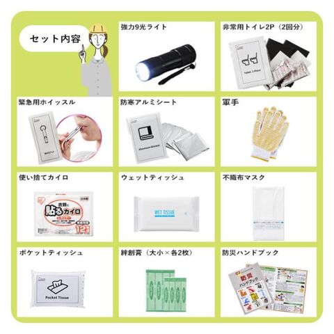 セット内容:避難用ショルダー&ウエストバッグ、強力9光ライト、ホイッスル、非常用トイレ2P(2回分)、ウェットティッシュ、ポケットティッシュ、防寒アルミシート、軍手、使いすてカイロ、不織布マスク、絆創膏(大小×各2枚)、防災ハンドブック