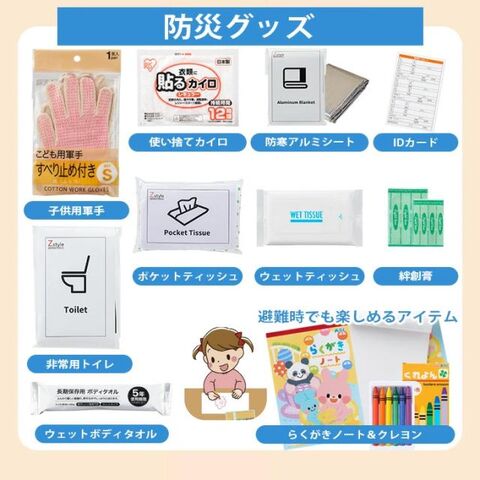 避難所でも楽しめるお絵描きノートやクレヨンもセットしたお子様用の防災セットです。