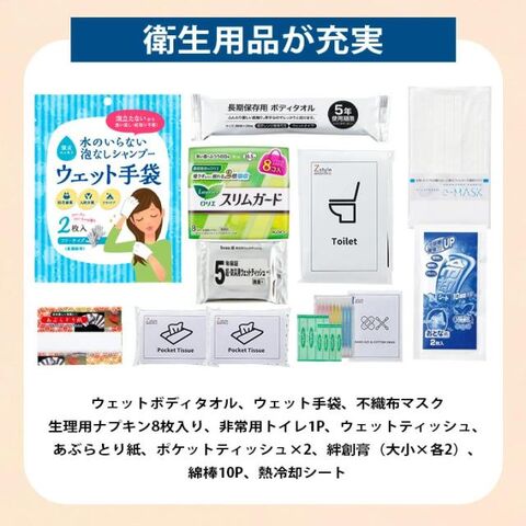 そのほか、緊急用ホイッスル、ライトやウェットティッシュなど災害時に役立つ防災グッズをひとまとめにした防災セットです。