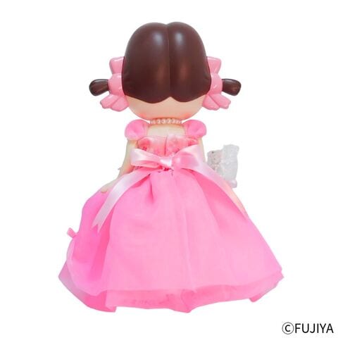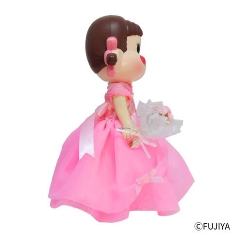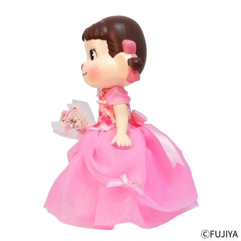 ふんわりと広がる桜色のドレスに身を包んだ、特別仕様のペコちゃん人形です。