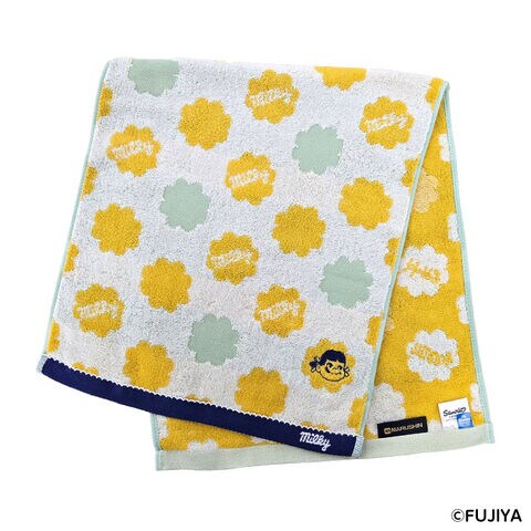 爽やかな印象のイエローカラーで見ているだけでミルキーが食べたくなるミルキーの包み紙をイメージしたキャリータオルです。