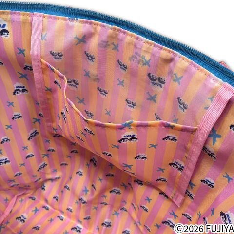 バッグを開けると、ピンクとイエローのストライプにペコちゃんとANA機をあしらった総柄の裏地が広がります。