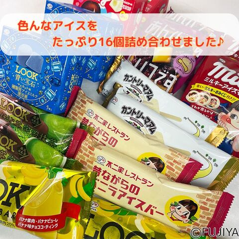 不二家の人気菓子「ミルキー」「ルック」の他、オリジナルのアイスをたっぷり16個も詰め合わせました!