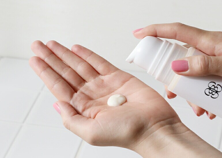 乾いた手に数回プッシュし(500円玉大くらい)、乾いたお顔に伸ばします。メイクとしっかりなじませ、ぬるま湯で洗い流してください。