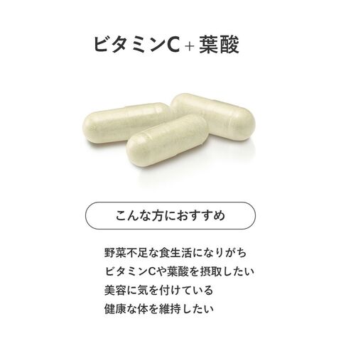 | ビタミンCで健やかに、美しく。 ビタミンの代表格として知られ、積極的に摂る人も多い 「ビタミンC」。皮膚や粘膜の健康維持を助け、美容もサポートしてくれる栄養素です。 こんな方におすすめ ✓ 野菜不足や偏った食生活になりがち | 特徴