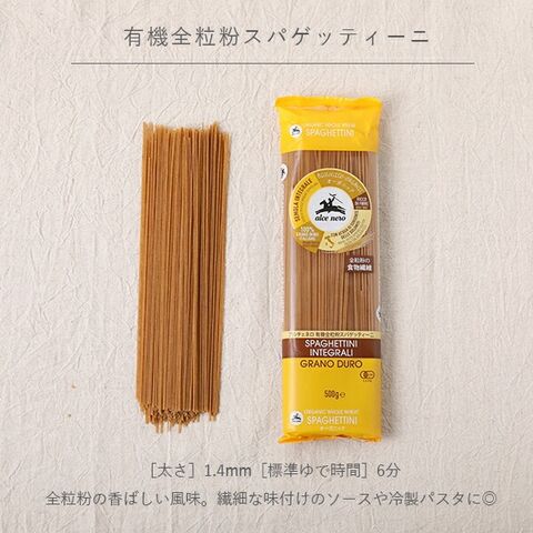 | 【有機全粒粉スパゲッティ】 [太さ]1.6mm [標準ゆで時間]8分 全粒粉の小麦は、外皮(ふすま)を含め小麦を丸ごと製粉しており、食物繊維や小麦の胚芽を含みます。全粒粉ならではの香ばしい風味。お好みのソースと合わせてお召し上がりください。 | ||||||||||||||