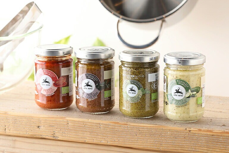 | 和えるだけで本格イタリアン。 風味豊かな味がたのしめるパスタペースト。 アルチェネロ(alce nero) 有機パスタペースト 130g ■ ジェノベーゼ・バジルペースト ■ ペースト・ロッソ ■ ズッキーニ・ペースト ■ ブラックオリーブ・パテペースト 有機栽培した野菜を新鮮なうちに加工することで、野菜本来の甘さ、酸味、香り、栄養価を保った、おいしい製品をお届けできるようにしています。こだわりをもって作られたパスタペーストをお楽しみください。 | ||||||||||