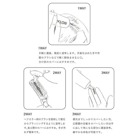※分け目にはチューブから直接塗布。生え際には、手の汚れないブラシのご使用がおすすめ。根元までカバーしたい方は手に出して気になる部分に塗布で細やかにカバーできます。
